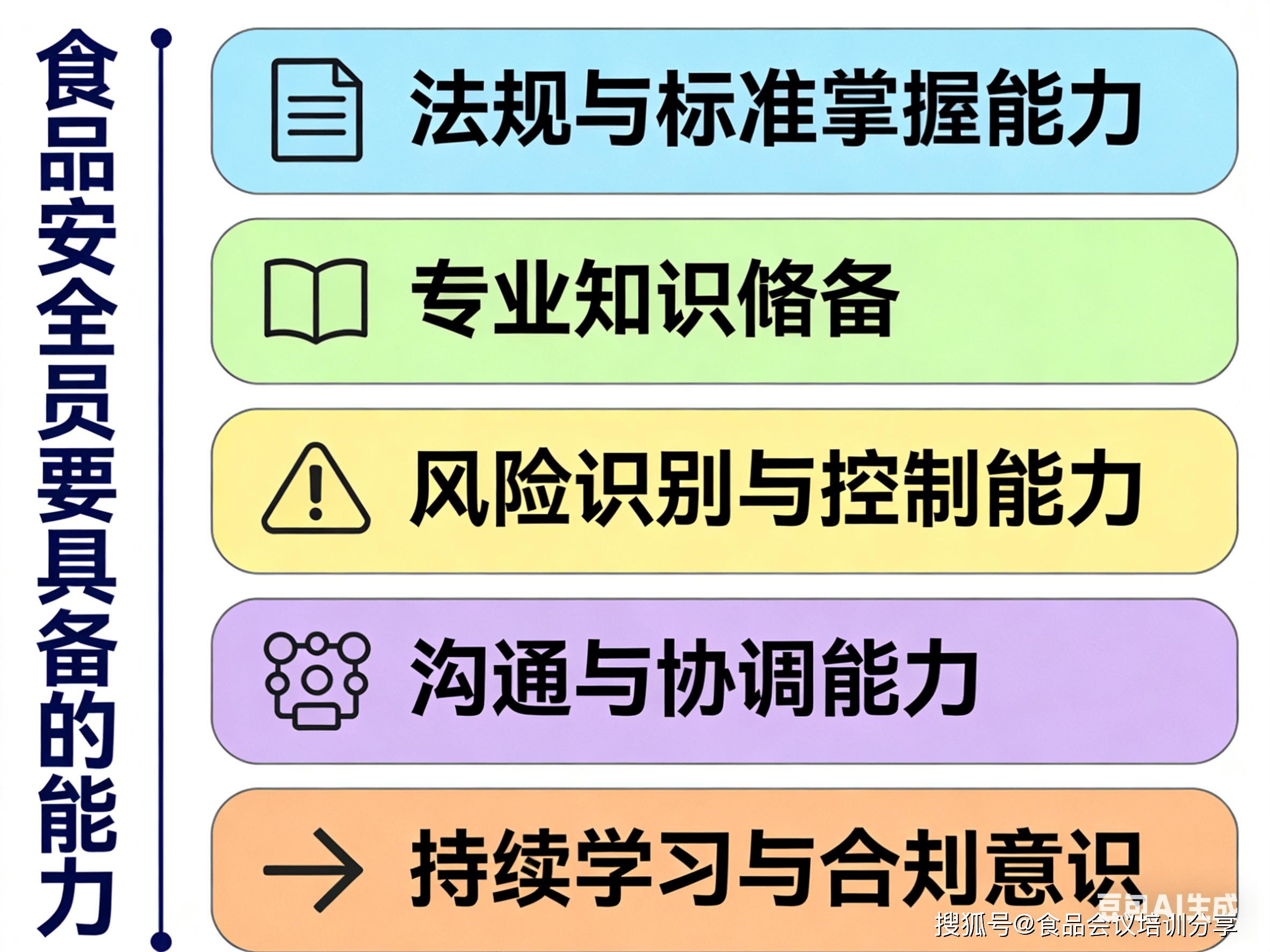 全面控制《中华人平易近国食物平安法》《食物平安法实施条例》《食物出产运营监视查抄办理法子》等焦点律例,明白企业的义务(如 “全过程节制”“从体义务”)及违法后果(罚款、吊销许可、刑事义务等)。熟练使用食物平安国度尺度(GB 系列),包罗原料平安尺度(如 GB 2762 污染物限量、GB 2763 农药残留)、出产卫生尺度(如 GB 14881 食物出产通用卫生规范)、查验方式尺度(如 GB 4789 微生物查验)等,确保出产全流程合适尺度要求。控制食物微生物学(如致病菌污染风险、菌落总数节制)、食物化学(如沉金属、添加剂、兽药残留等化学风险)、食物工艺学(如热加工、冷藏、包拆等环节的平安节制点)等焦点学问,能识别分歧食物品类(如生鲜、罐头、烘焙)的特有风险。熟悉 HACCP(风险阐发取环节节制点)、ISO 22000 食物平安办理系统、SSOP(卫生尺度操做法式)等系统的焦点逻辑,能理解 “风险防止”“过程节制” 而非 “结尾查验” 的办理。能通过原料验收、出产过程放哨、成品查验等环节,识别生物风险(如沙门氏菌、霉菌)、化学风险(如不法添加剂、农残超标)、物理风险(如金属异物、玻璃碎片)及工艺风险(如杀菌不完全、冷链断链)。能针对识此外风险采纳立即办法(如暂停出产、隔离问题原料),并鞭策落实改正防止办法(如优化清洗流程、升级检测频次)。能取出产、采购、发卖等部分无效对接(如向采购部分明白原料验收尺度,向出产部分强调环节节制点操做规范),确保食物平安要求贯穿全链条。能共同监管部分的查抄(供给记实、注释流程),或向消费者解答根本食物平安问题。关心律例取尺度更新(如国度卫健委发布的新国标、市场监管总局的监管动态),自动加入行业培训(如 HACCP 内审员、食物平安办理员证书培训),确保办理方式取行业要求同步。具备 “零” 的合规认识,明白食物安满是企业底线,杜绝 “侥幸心理” 或 “成本优先” 的违规操做。感乐趣的记得留言哦。食物会议培训核心,分享食物行业会议培训动态,充实满脚您的进修需求。前往搜狐,查看更多!